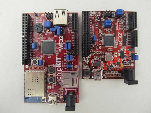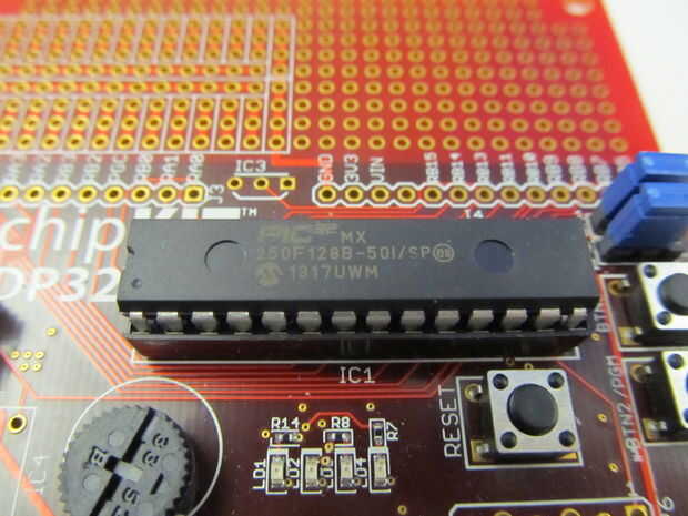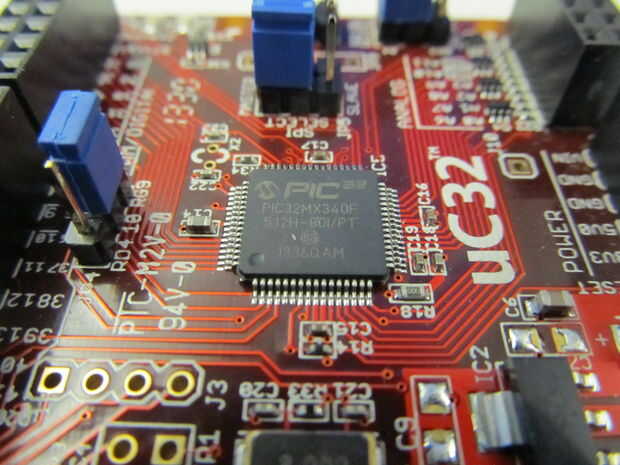 Cada placa chipKIT tiene un microcontrolador diferentes. Si te fijas bien (quizá deba usar una lupa) se puede leer la etiqueta que te dice lo que es. Por ejemplo, sobre tengo un cierre para arriba de microcontrolador de uC32, que es el PIC32MX350F512H. Después de eso tengo un closeup de la DP32, que utiliza el PIC32MX250F128B.