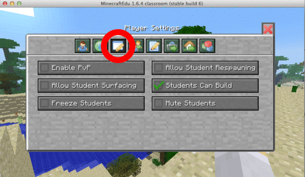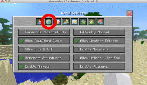 Pulse 'P' en su teclado para sacar el menú maestro de MinecraftEdu. Utilice los iconos en la parte superior del menú para navegar por las diferentes ventanas. Alterar cualquier configuración como sea necesario por necesidades de sus estudiantes y el mundo del juego. Por ejemplo, los estudiantes quieren a menudo efectos de tiempo encendidos pero rápidamente cambian sus mentes si iluminación causa incendios en sus estructuras.