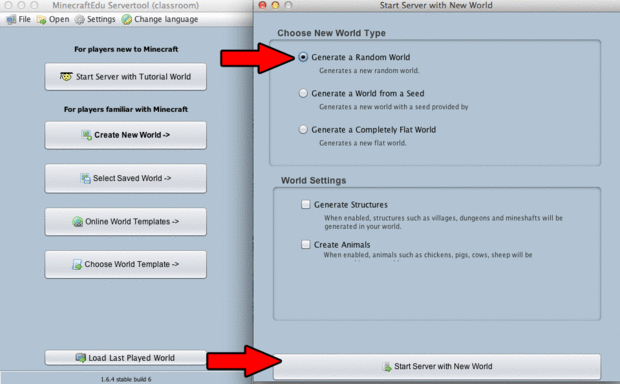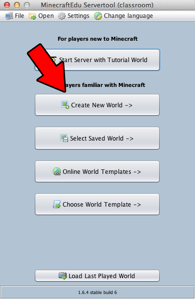 Nota: Usted puede intentar usar un mundo de semilla o crear un mundo totalmente plano en otro momento. Además, la configuración del mundo en la parte inferior de la pantalla son opciones que puede considerar seleccionar. Esta elección dependerá de las necesidades de sus estudiantes. He encontrado, a este punto, que las estructuras o los animales pueden llevar a más distracción que apoyo.