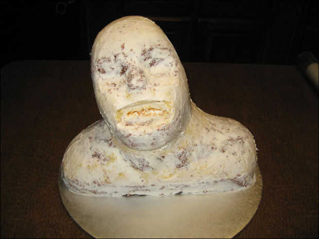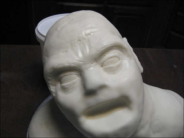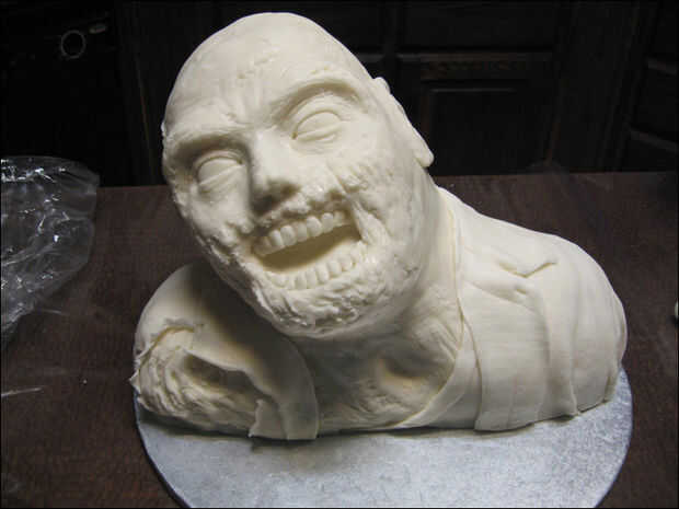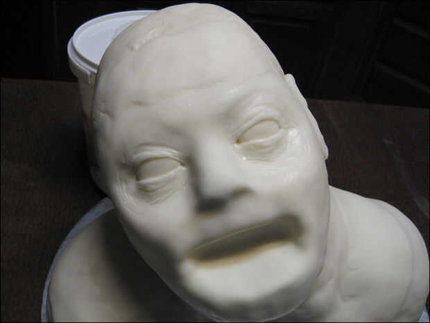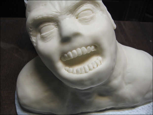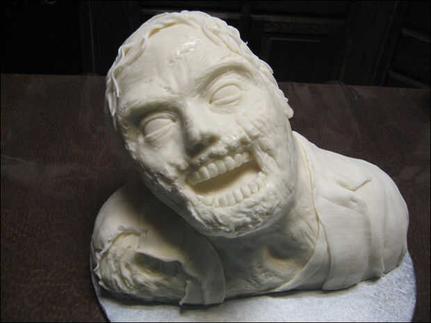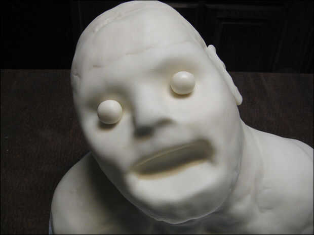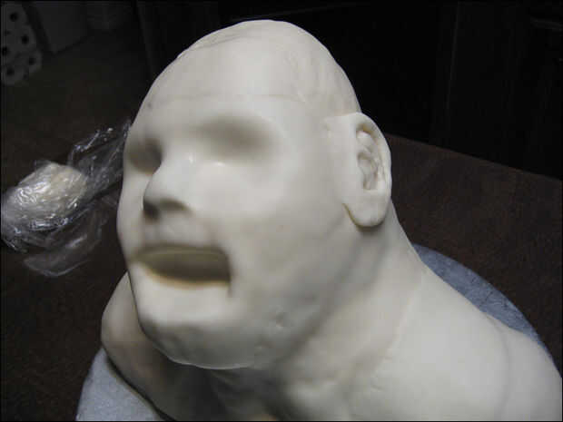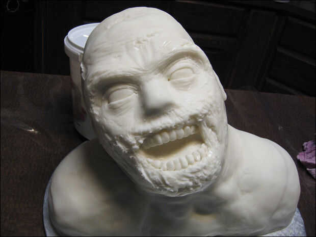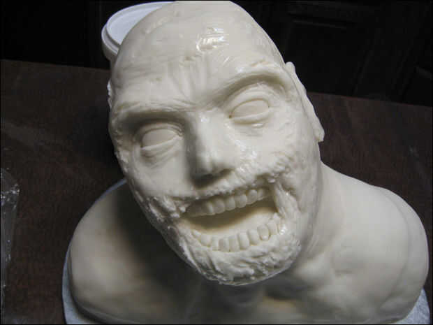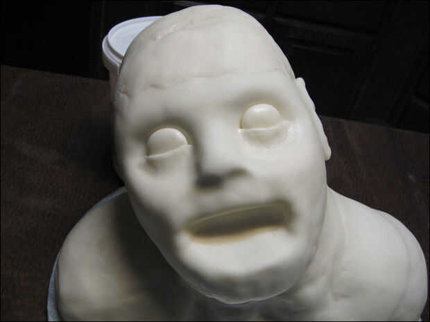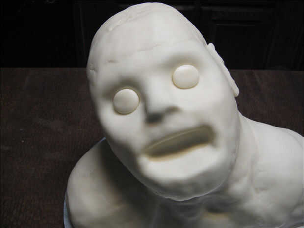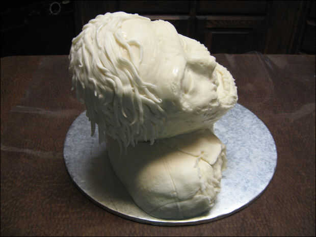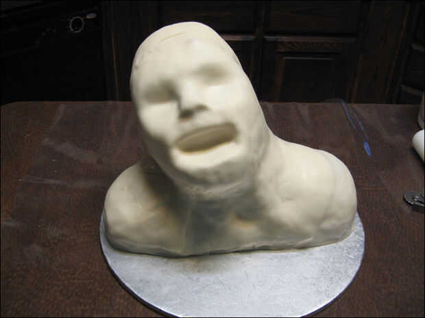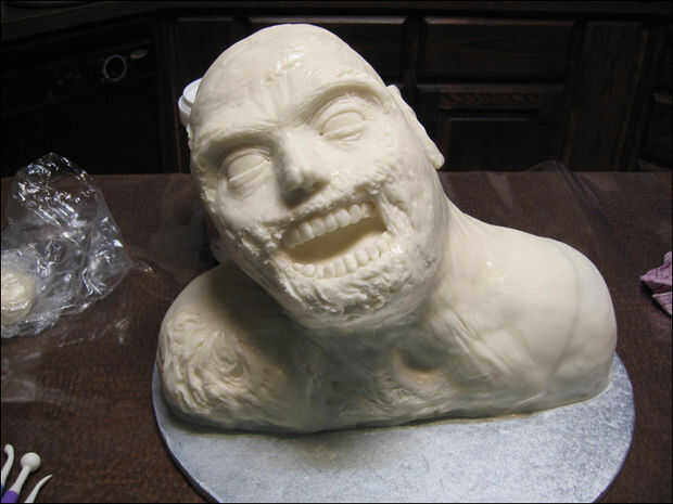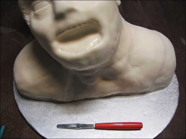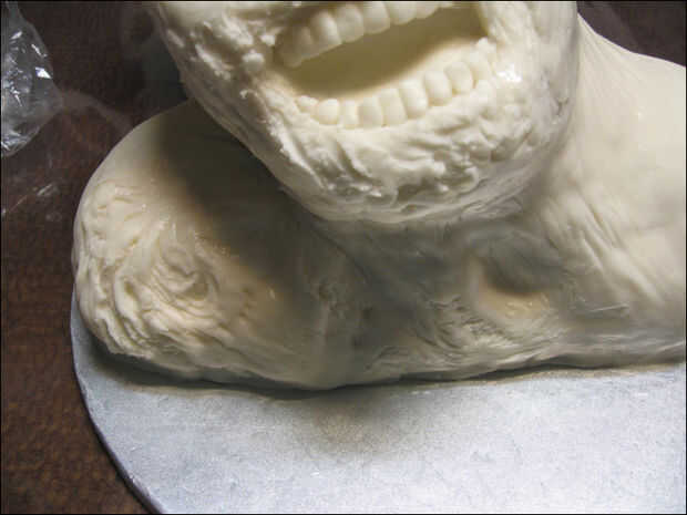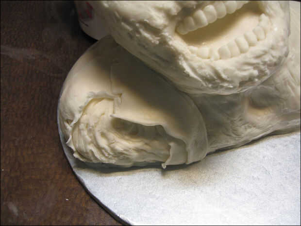 A continuación, añadí fondant más a la nariz, suavizar y dar forma y texturizado. Luego continué texturizado en la cara. Cepillo en agua y utilizar diversas herramientas para raspar, perforar y detalle de la piel para que se vea como piel de zombie.