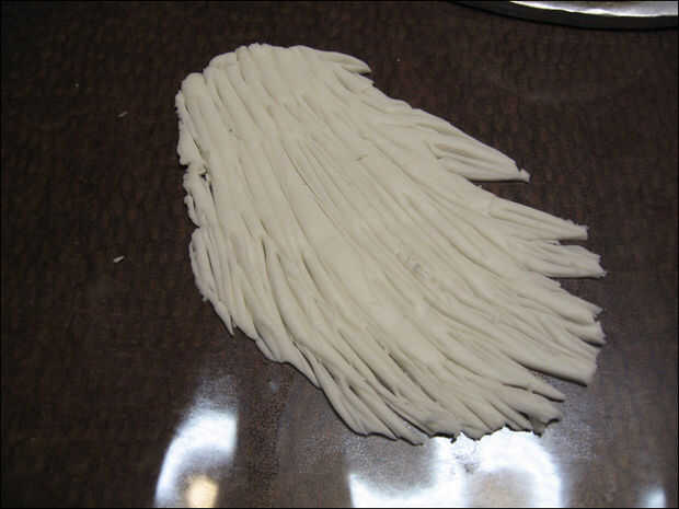 El cabello era la parte más difícil. Apliqué las tiras de fondant, disponiéndolas como puse, otra vez con agua.