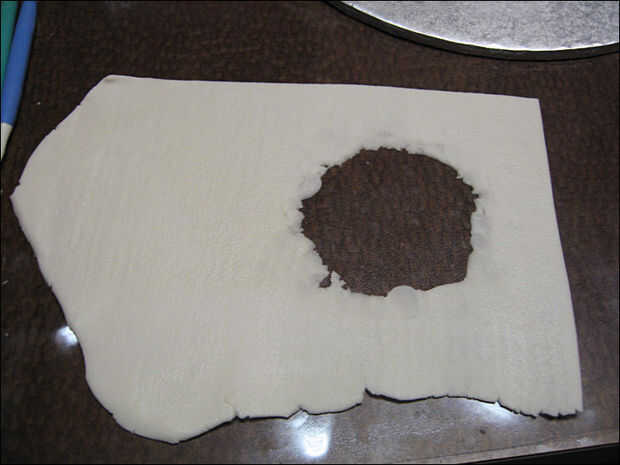 Para la parte delantera del hombro que se ve a través de la camisa, hice una pequeña pieza de fondant, lo textura y había pegado en agua. Siguiente pastel de la ropa, que yo y corte, textura luego colocando una toalla limpia sobre el fondant y presionando en la pasta de azúcar para obtener una textura de paño-como.
