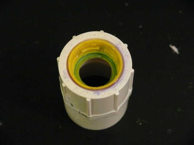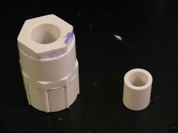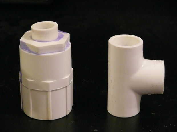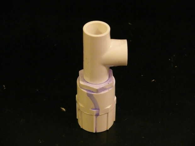 Ahora vamos a juntar la mayoría de las piezas de pvc. Ampliado el agujero en la tapa solo para darme un poco más espacio para trabajar pero no es necesario. Recuerde usar púrpura imprimador y cemento de PVC en cada paso.