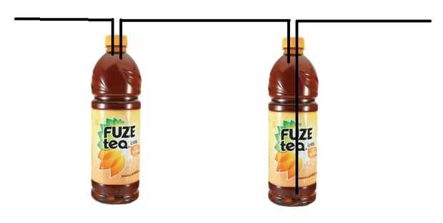 Un tubo deberá conectar las dos botellas y dos más deben extenderse desde las botellas, una para cada botella. Esto significa que cada botella tiene 2 orificios.