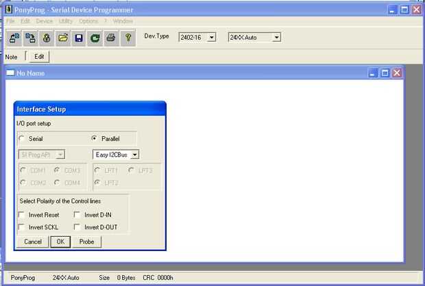 ahora todo lo que tienes que hacer es enchufar el programador, enchufe el cable de usb, sujete el conector de la eeprom en el chip e iniciar ponyprog. una vez en ir a opciones, configuración y asegúrese de que se encuentra en "Bus I2C fácil", se selecciona el puerto de la impresora y nada más (véase pantalla de tiro). en la pantalla principal, asegúrese de que el tipo de desarrollo es "2402-16" y «24XX auto» (véase pantalla de tiro). luego de leer su ficha para asegurarse de que todo lo trabajado.