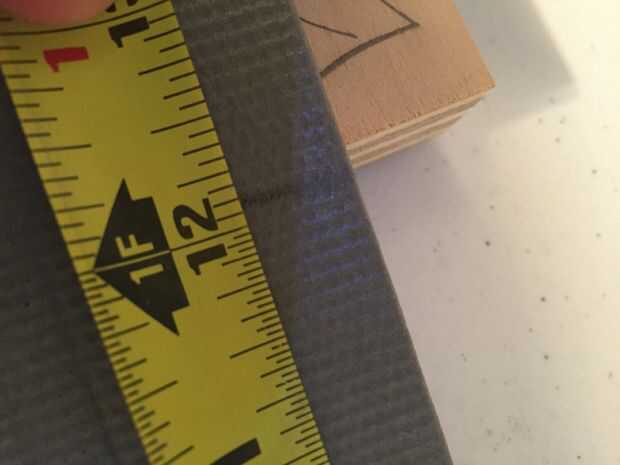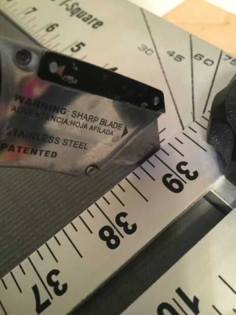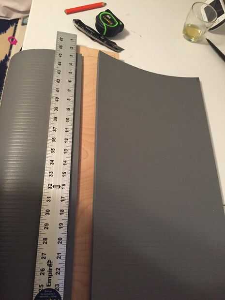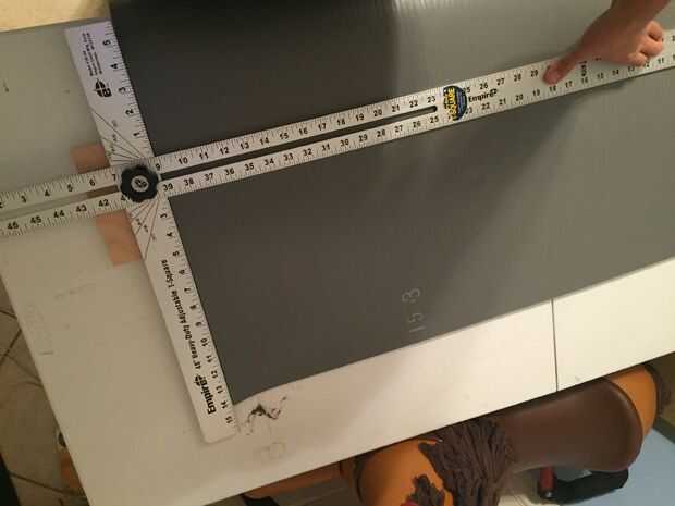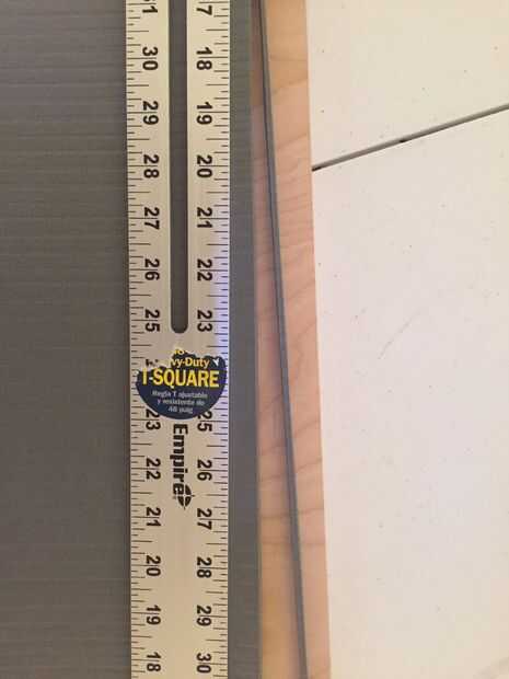 Una vez que mi estación de trabajo se estaba lista para empezar a cortar. Un aviso importante... la máquina que corta mi 14' rollo de material no cortó un cierto ángulo recto. Configurar el material y el uso de mi plaza de T corté una tira fina para empezar con un borde limpio, verdadero y recto. Asegúrese de aplicar una buena cantidad de presión a la baja en la Plaza una vez que alinee su corte. Usando el lado de la plaza como un guía y el cuchillo tirado duro y cortado a través el material limpio. Después de que fuera hecho tomé mi primera medición de la planta que actuaría como la zona de aterrizaje también conocido como base. Asegúrese de que esto es suficiente para cubrir una cantidad decente de espacio. Marque sus medidas con el lápiz en el material. Alinee su corte otra vez con el cuadrado de t y tire esa maquinilla de afeitar a través. Después de eso corté lo que eventualmente sería la principal pieza que se encuentra en el piso en la parte superior de las escaleras.