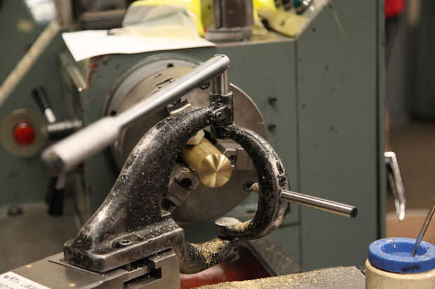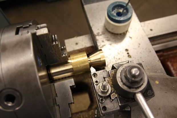 Gire hacia abajo la acción de la barra de latón según las especificaciones indicadas en el dibujo. Utilizar un cortador de radio para formar la forma abovedada en la parte superior del mango y una cero herramienta zurda de rastrillo y el resto compuesto para cortar la cara angulada de la manija.