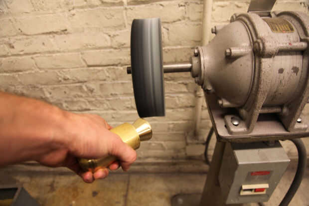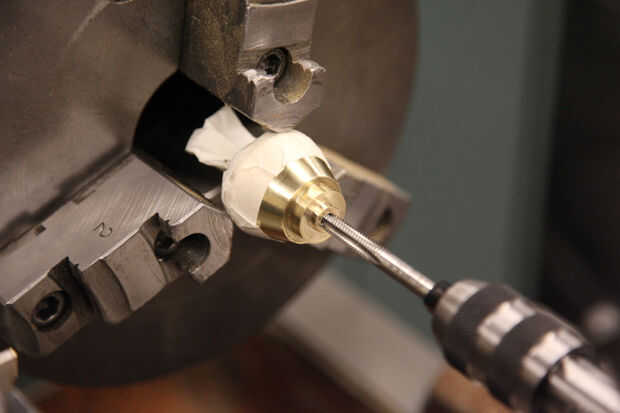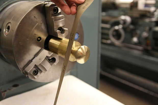 Lije la pieza mientras está todavía en la máquina para conseguir un acabado consistente. Lo Buff y luego la cinta la pieza de mango para taladro y grifo nuevo en el torno.