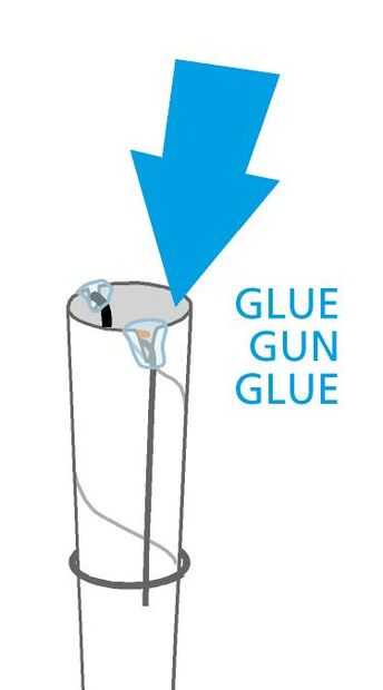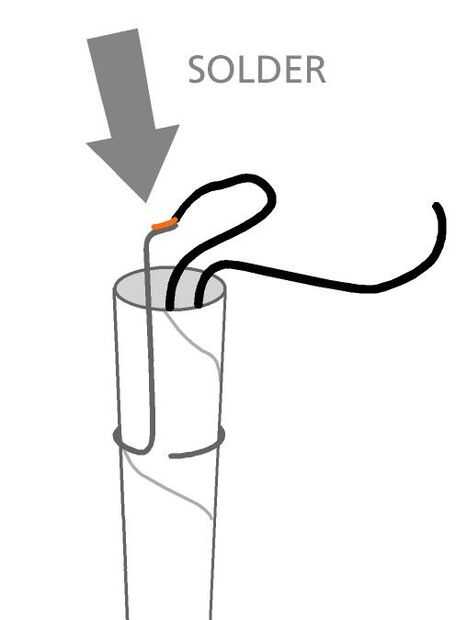 De la soldadura de los cables en las lengüetas de la soldadura. para cada ficha de soldadura, corte una pequeña v en forma de agujero en la parte superior de la llanta de la gran final. Cuando se sueldan el cable a la ficha de soldadura de clip, resto el clip hacia abajo en la uve en forma cortada y segura con una pequeña gota de pegamento de la pistola de pegamento, lo mismo para ambas partes del clip de papel, asegurándose de que no toque en la parte superior.
