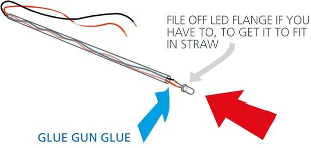 que tendrás que presentar la brida del LED para conseguir que encajen en la pajita. Justo antes de que usted Deslice el LED en pone una pequeña gota de pegamento pistola de pegamento en el extremo de la pajilla para mantener el LED en su lugar.