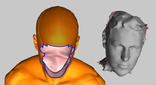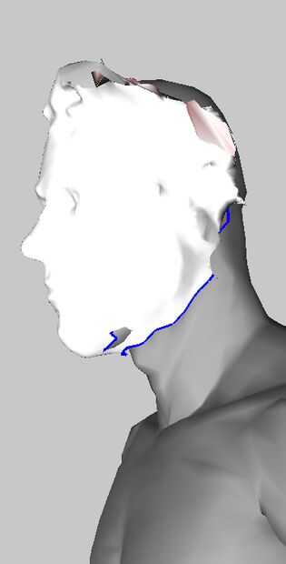 He seleccionado el cuerpo y utiliza la herramienta lazo para resaltar el rostro de la modelo de material de frente a mentón, mejilla a mejilla. Luego utilicé la edición de descarte para eliminar completamente la cara. Si yo pudiera tener yo hubiera borrado y relleno, dejando una cara plana sin rasgos distintivos en vez de un agujero, pero el problema con los ojos y la boca impidió. Este paso ayuda a mitigar los problemas que puedan derivarse, decir, nariz del cuerpo empujando a través de mi cara. Es más fácil poner una cara nueva a una cabeza en blanco.