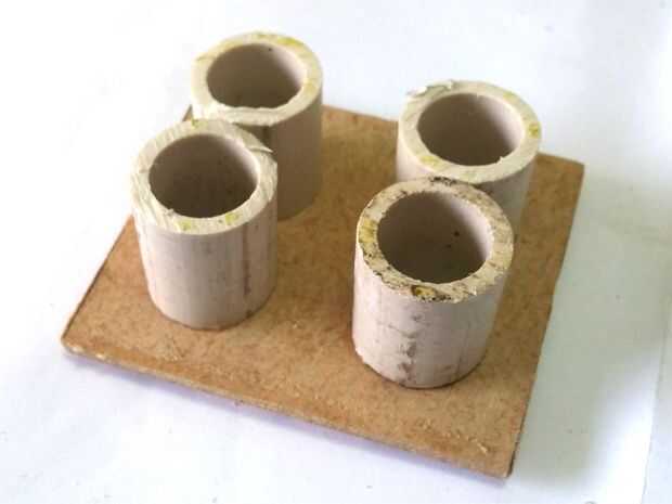La cara posterior tiene 4 agujeros. Para que las plumas estén posicionadas correctamente, debe pegar las 4 piezas de tubo en esta cara y fijo con los tubos en el interior de la cabeza. Con esto, se cerró la Asamblea de la cabeza sí mismo.