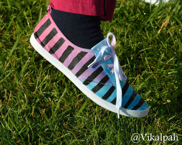 Este paso es totalmente opcional. Si desea agregar rayas a sus zapatos. Use cinta de enmascarar y pintura de tela negra para agregar rayas todo tus zapatos y dejar secar. Es así de fácil:). Roca el verano con tus zapatos nuevos y coloridos.