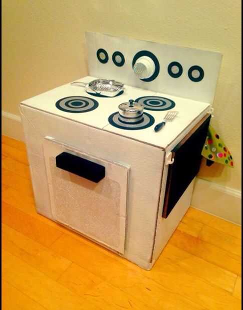 Utilizando simplemente una caja de cartón, cartulina, pintura en aerosol blanco barata, brillo negro y plata tarjeta stock de papel, un sombrero de fiesta plata holograma, un tapón de jabón de lavandería, una pistola de pegamento y algunos artículos que tenían en mano, he creado un juego de cocina para mi niño de 18 meses de edad.