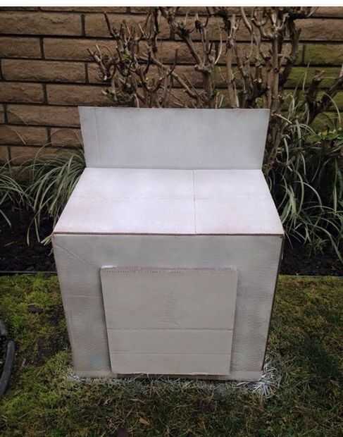 Usé una caja de cartón para crear el cuerpo de la estufa. Una pieza extra de cartón fue pegada a la parte posterior de la caja, usando una pistola de pegamento caliente, agregar la parte de la estufa donde irían las perillas.
