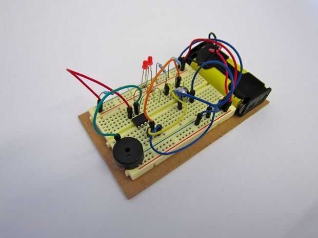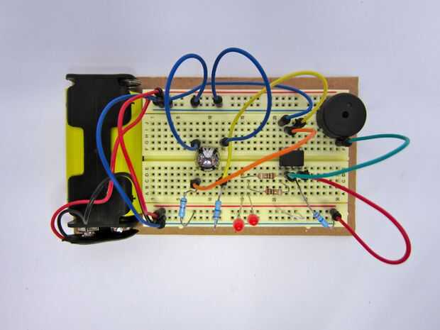 Construir el circuito en un protoboard para hacer pruebas. Una diferencia importante es que la función de tono sobre el ATtiny no funciona con un valor de parámetro de 50. El sonido comienza solamente en un valor de aproximadamente 100.