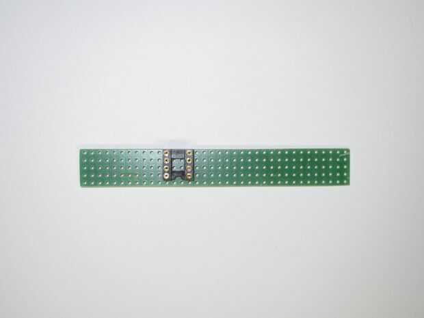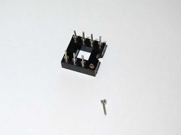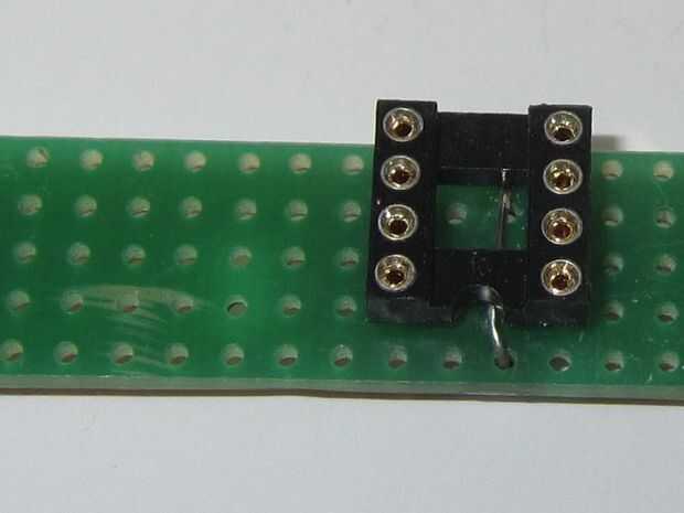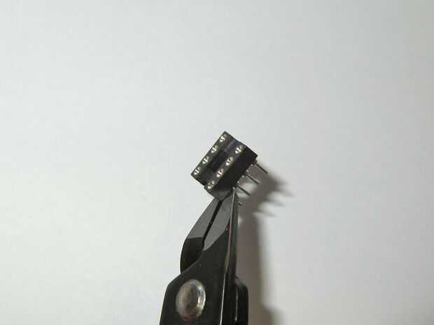 Sin embargo, un buen comienzo es primero poner el zócalo del IC en el lugar, como referencia para el resto de componentes. Primero se corta la pierna correspondiente al pin de reset. Que aún funciona al hacerlo no, como el pin de reset estará constantemente conectado a VCC, pero que sacará alguna corriente, que sería un desperdicio.