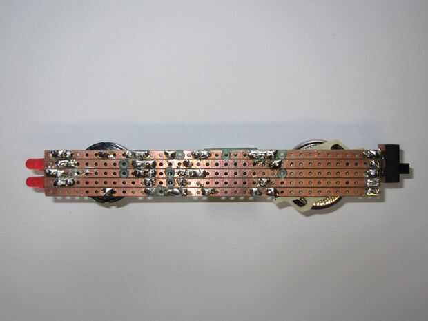 La placa de circuito se basa en una pieza de placa de prototipos del "autobús común" tipo. Es bastante compacto y utiliza sólo un número limitado de puentes y cortes en las rutas prefabricadas.
