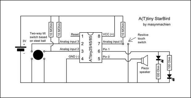 Es importante un puente de alambre que conecta las carreras de ruta de acceso superior e inferior se coloca primero debajo de él (realmente olvidó al principio yo mismo y que luego en violín). Va desde la pata de tierra de la IC zócalo/ATtiny al otro lado. Usé un final de chatarra cortar una pata del resistor de hacerlo.