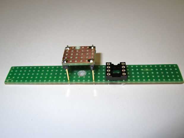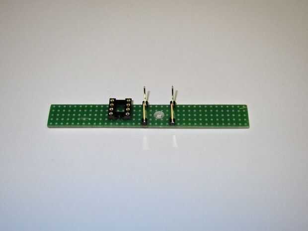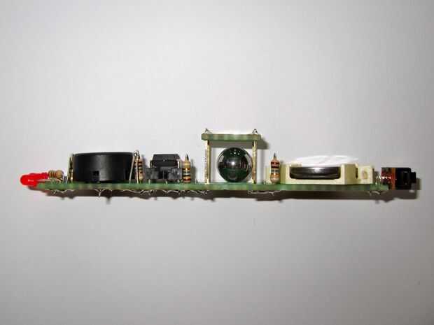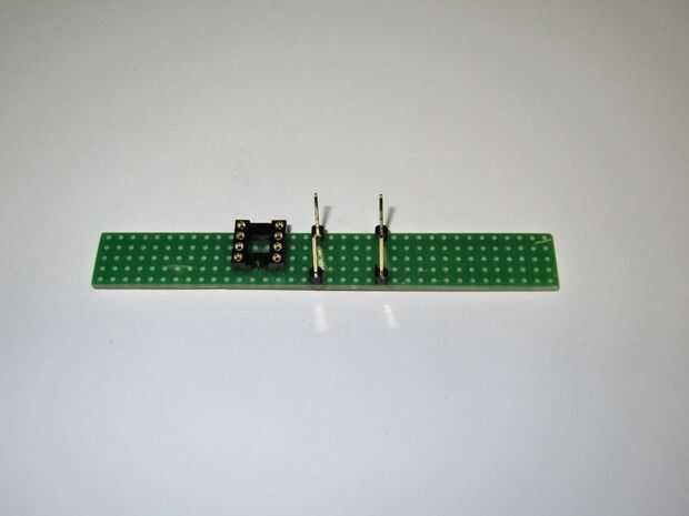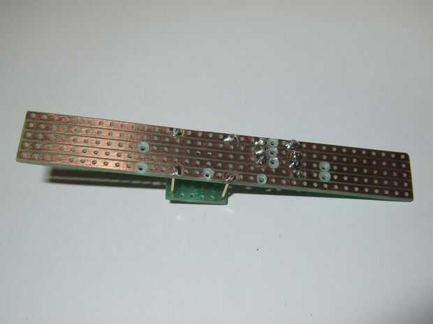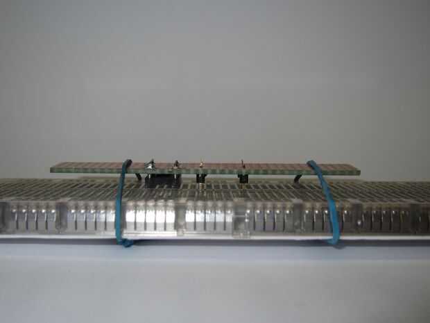 Con el balón en el lugar para comprobar la altura (permite cierto margen de sobra) cambió de puesto para arriba las piezas de plástico para apoyar un tablero de circuito pequeño de 5 x 6 y soldadas en su lugar. No te olvides de cortar el camino entre las dos clavijas de entrada.