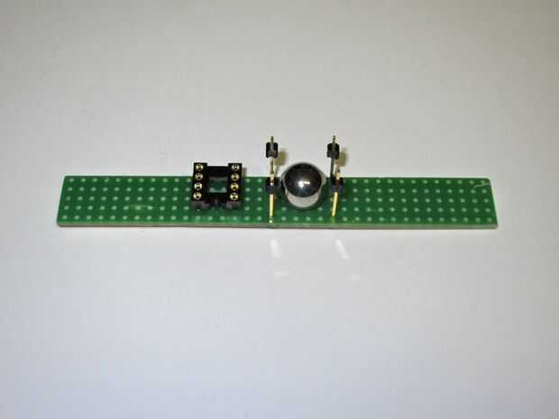 Como se muestra en la versión de protoboard es fácil hacer una inclinación interruptor con una bola de acero y 4 pines. Funciona, pero no siempre. Usted puede conseguir pins con una superficie que hace buen contacto eléctrico (plata, níquel, oro), pero las bolas de acero comúnmente disponibles no se optimizan para contacto eléctrico. Comúnmente se hacen de cromo acero aleado, optimizado para la carga mecánica. No pude encontrar bolas recubiertas. Aprendí que bolas nuevas, limpiar con lana de acero de trabajo lo suficientemente bien como para un "juguete". Bolas de acero de doe cojinetes usados no funcionan bien, incluso después de Profondo desengrasado y limpieza.