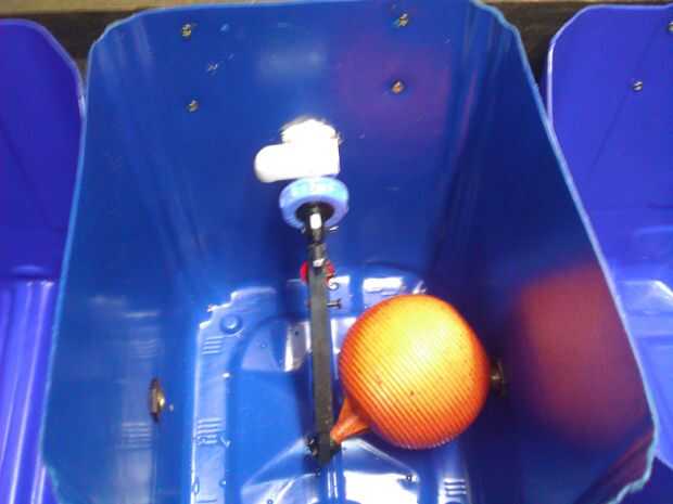 y luego instalado la válvula de flotador. Esto fue sólo una válvula estándar de una cisterna de WC y la única parte del proyecto que tenía que comprar. Si vas a hacerlo tú mismo asegúrese de que la válvula se instala a través del tablero de madera. Si no hay suficiente flexión en los costados de los tambores que la válvula gire a los lados y nunca realmente shut off, pero al menos sus animales no pasará sedientos.