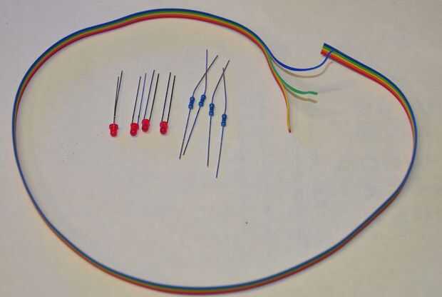 Perfore unos agujeros en la parte delantera del reloj para los LEDs en cada esquina y montar los LEDs usando una pequeña cantidad de pegamento caliente. Solde un resistor de 270 ohms a cada cátodo (cable corto) y conecte el cable de tierra de su cable de 5 conductores a cada resistencia.