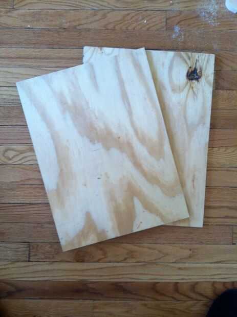 Agarra uno de sus tableros de madera contrachapada de 15 "x 20" y un conjunto de piezas de adorno de Ensenada. Si no cortan, necesita dos 16,25" y dos longitudes de 21,25". Estas medidas son para el final del punto del ángulo de 45 grados. Asegúrese de cortar el 45 la forma correcta de utilizar las fotografías como guías.