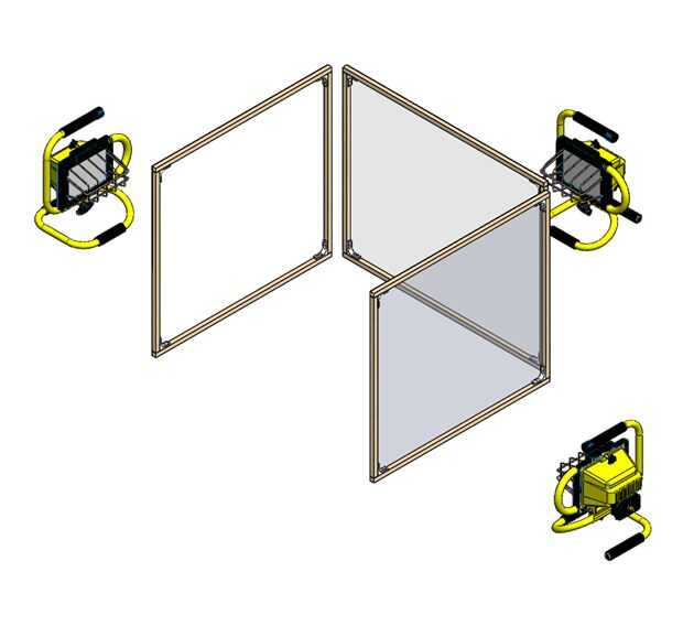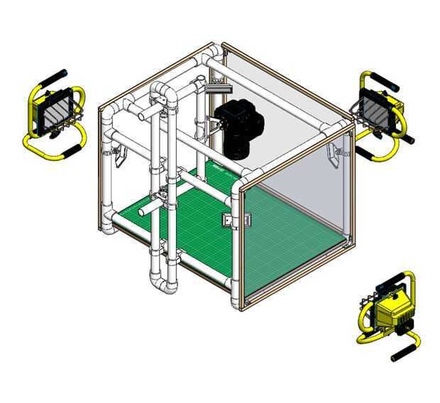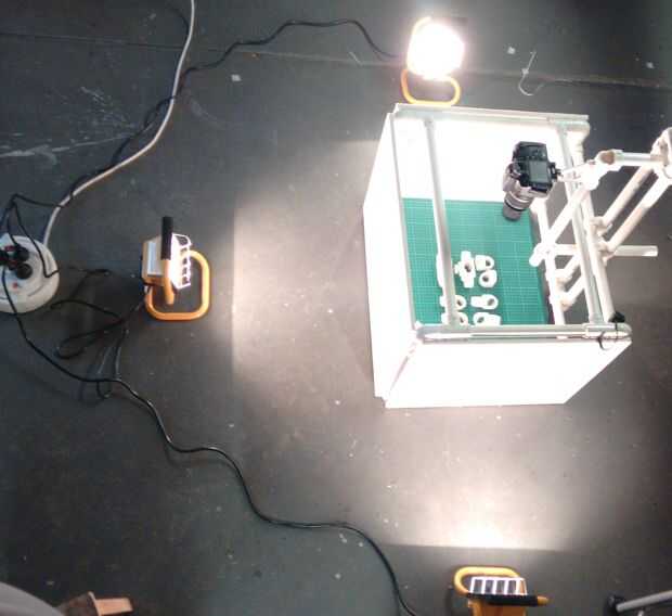 Consideré que encierra la brecha de las lámparas a los paneles en material reflectante pero decidió el acceso a las lámparas (para el ajuste de la intensidad) fue más importante. La caja de luz y las lámparas deben colocarse en una mesa de aproximadamente 1200 mm x área de 1800 m m (o en el suelo). Cuando no está en uso las lámparas se pueden almacenar en la caja de luz.