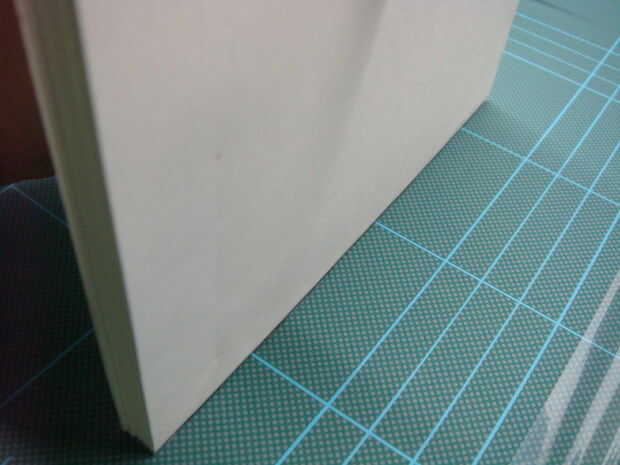 Una vez seco, retírelo de la envoltura se aferra y lo mismo, recortar los bordes. Tenga cuidado de no cortar el papel. mina puso en la almohadilla de corte con la cara de la columna vertebral hacia abajo. Luego se deslizan la navaja a los lados para recortar. el resultado se muestra en la imagen.