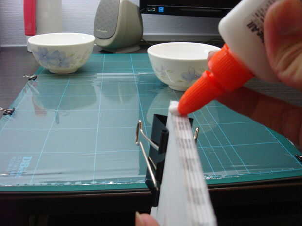 después de eso, gire a la espina dorsal hacia abajo y coloque a los soportes en la posición recta "vertical". Tenga cuidado no se deje engañar por el error de paralaje. Notaremos que hay pegamento extra que sale de los lados. Eso es normal. Límpielos suavemente con el cepillo que utiliza para aplicar pegamento previamente. La idea aquí es para no acabar con los bloques de la cola que aparecen aleatoriamente en los lados. Después de que se limpian, espacios vacíos pueden aparecer después de un tiempo. Como el pegamento a lo largo de la parte exterior de la columna vertebral son planas, los orificios están bien.