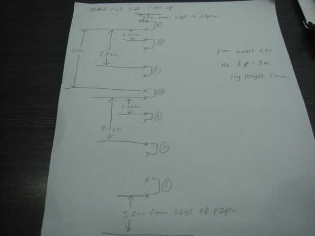 Después de eso, se podrá consultar el resto de la marca de la bala superior (consulte el cuadro. el punto de referencia es la marca de la pierna si la primera bala). La primera medición es de 1,2 cm desde el punto de referencia. en segundo lugar a 3.1 cm y el tercero a 5 cm. Ahora habría hecho la marca para sólo una de las patas. la marca de la otra pata de la grapa bala se realiza del mismo modo como la parada y fondo básico las marcas de la bala (con referencia a la bala grapa te despliega hacia fuera).