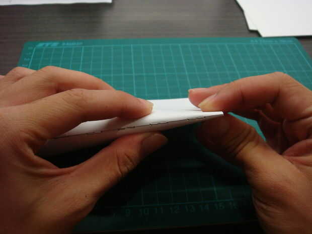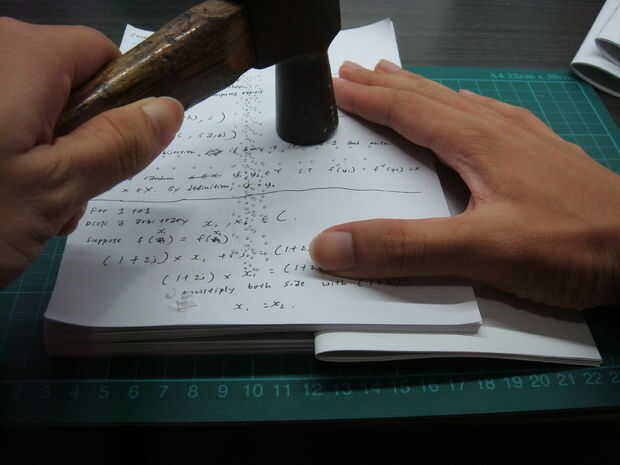Para completamente aplanarlo correctamente, coloque el folleto con algunos residuos de papel. El papel debe ser grueso. Solo basta con crear un pequeño colchón va a hacer. Entonces martillo hacia abajo a lo largo del pliegue. Le dan un buen martillo para hacerlo tan plano como sea posible. * Me mina en el suelo. la imagen es sólo para ilustración. Mi mesa se derrumbará si fue hecho allí *