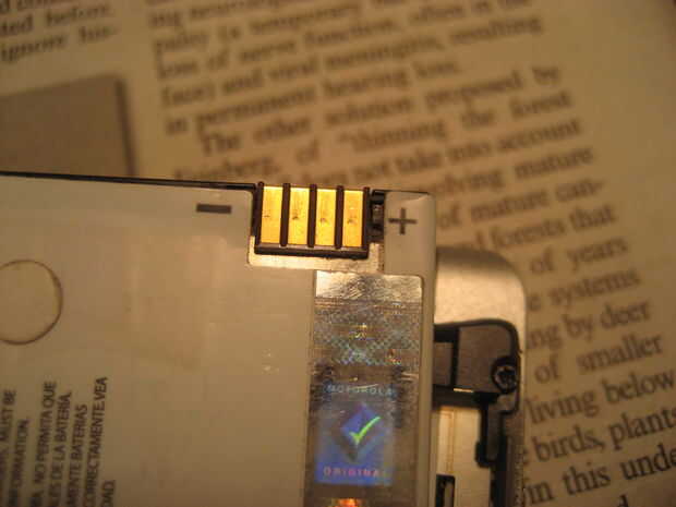 Encontrar qué terminales en el teléfono son positivos y lo que son negitive. el teléfono no puede decirlo, pero la batería es legalmente necesaria que la polaridad.