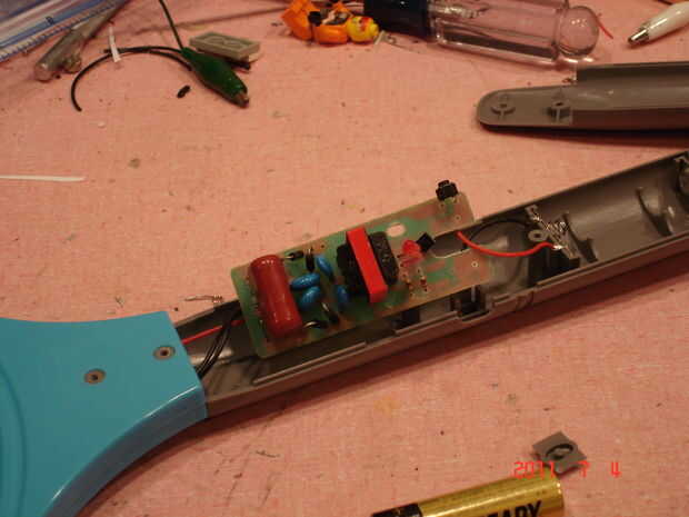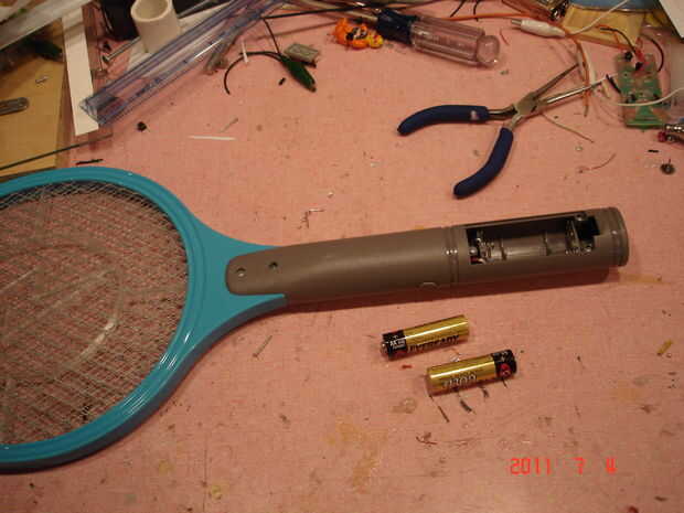 El zapper del insecto es bastante fácil de abrir. En primer lugar, retire la tapa y luego retire los tornillos. Hay dos hasta cerca de la cabeza de la raqueta, dos cerca de la parte inferior del compartimiento de la batería y otro en la parte superior del compartimento para baterías. Una vez retirado, la parte de atrás la mitad del mango se puede levantar, exponer la parte posterior de la placa de circuito. Retire el tornillo en el centro de la placa, cortar los cables a la cabeza de la raqueta como cerca de la cabeza de la raqueta como sea posible y cortar los cables que unen a los contactos de la batería. Ahora que la Junta se quita, no es necesario el resto de la raqueta.
