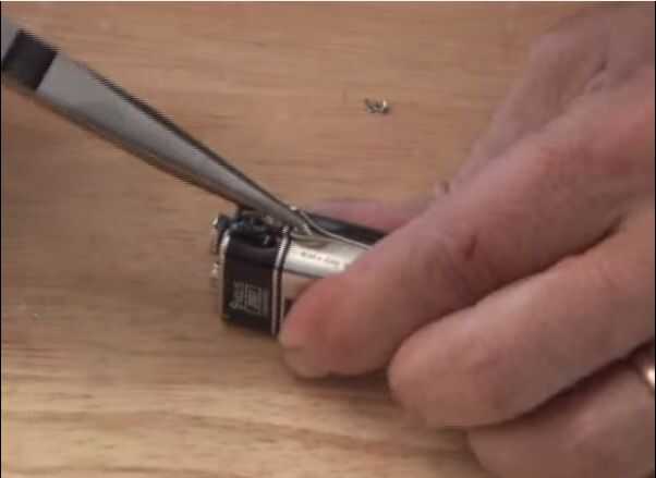esto es una forma rápida para mantener los cables a los terminales de un AAA o una batería AA para los experimentos eléctricos. Dos pinzas modificados están montados en un espaciador de madera gruesa de 3/4". Los muelles de pinza para la ropa mantien