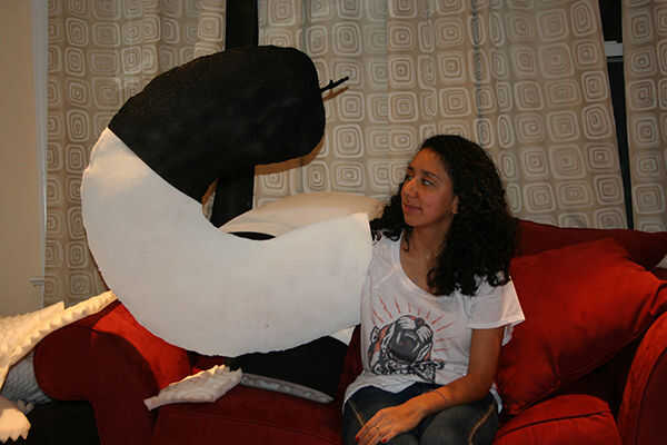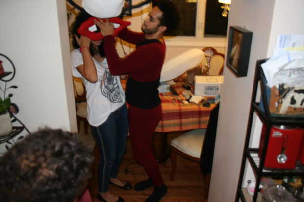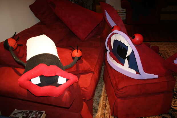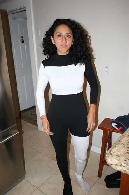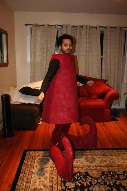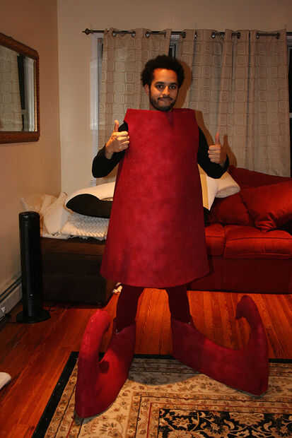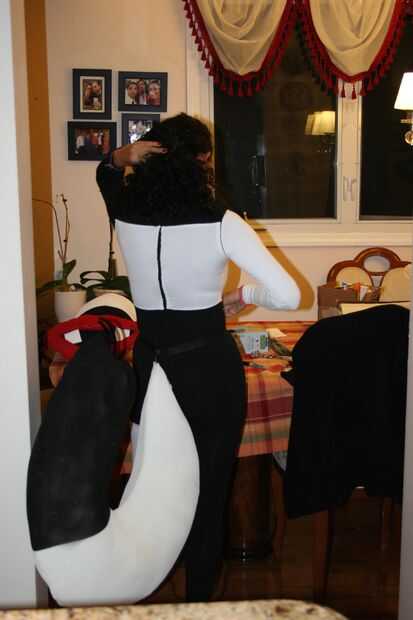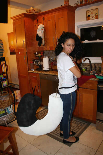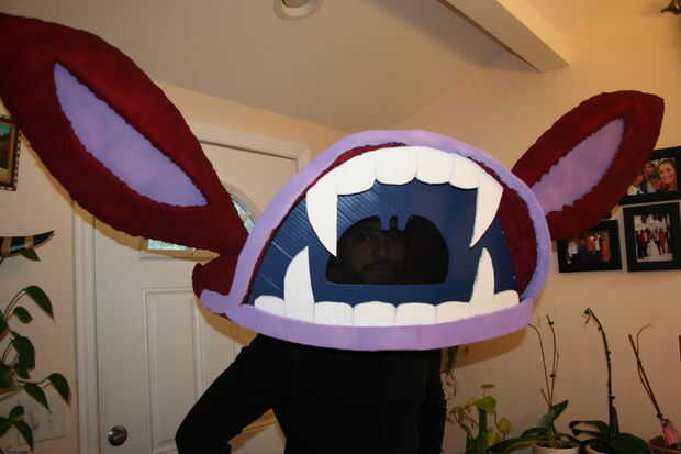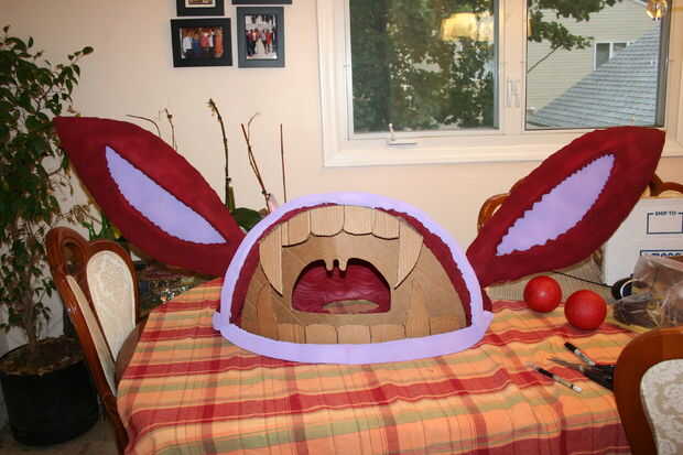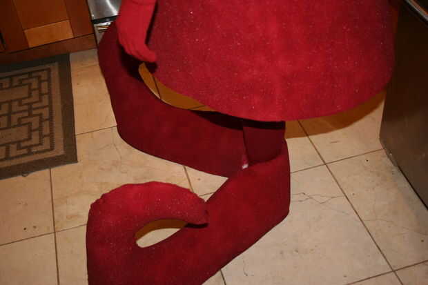Añadido dientes utilizando cartulina, había pegado de las piezas de la cabeza con pegamento caliente y había unido todo con ganchos de alambre para refuerzo. Mi novia sutura su unitard a sí misma, y compré algunas medias Burdeos para mis piernas y brazos. Para mi los zapatos pegué un par de zapatillas en la espuma grande los hecho, rellena con retales de espuma cama y sellar la parte inferior con una suela de cartón. Más tarde agregué algunos cinta del apretón del patín para la tracción.