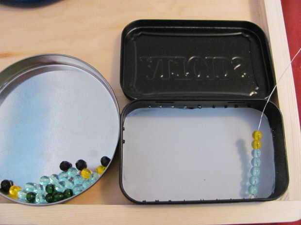 Después de tener los 7 granos correcto del alambre, entonces la cadena el extremo del cable a través del primer agujero en la esquina superior derecha.