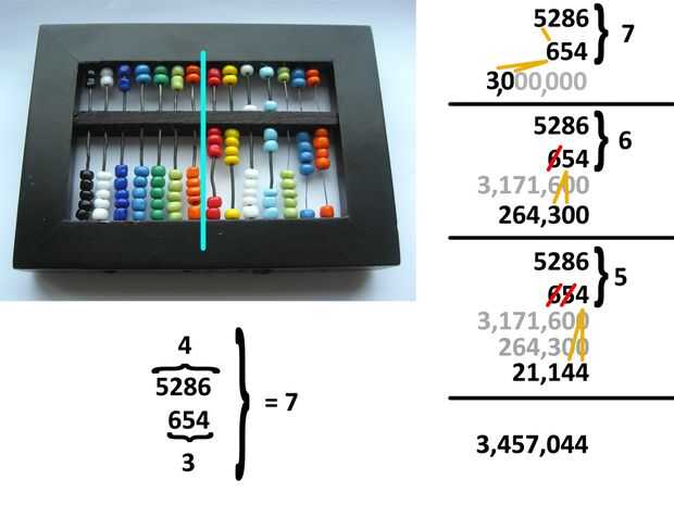 Cayendo el primer dígito del multiplicador hay ahora sólo 6 dígitos, esto significa que vamos a empezar en la columna 6 más para el siguiente multiplicando. Repetir la multiplicación, adición de granos en cada columna y transportar los restos.