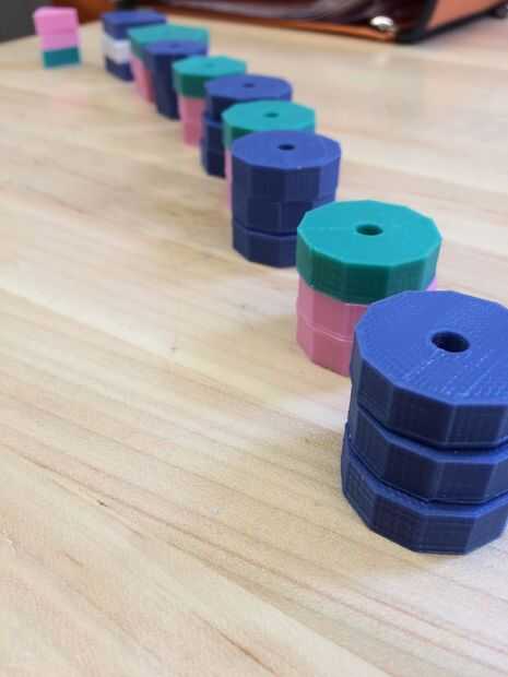 Usted tendrá que diseñar sus piezas para su ábaco, nos que decidimos por utilizar polígonos y aumenta la cantidad de lado para cada número que nos mudamos en cada barra. Esto significó comenzamos con un triángulo y terminó cada barra con un dodecágono (polígono de 12 lados)