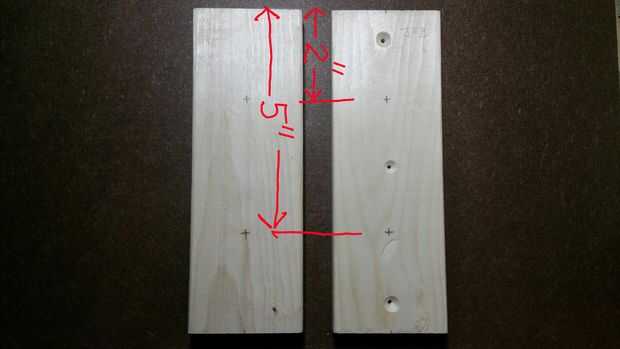 A partir de la superficie superior de la placa inferior, miden 2 pulgadas desde el frente hacia el borde y coloque una marca de lápiz. Luego mida 5 pulgadas desde el borde de frente y una marca de lápiz. Ambas marcas deben ser exactamente centrada (Foto 3). Siga este procedimiento para hacer dos marcas en la superficie inferior de la placa superior.