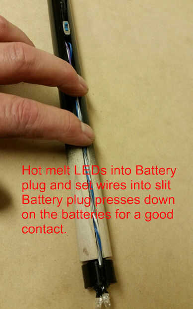 También, utilice pegamento caliente y pegamento los LEDs en el extremo de la clavija de la batería.