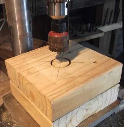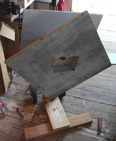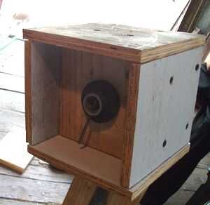 Para hacer la bobina hice un cubo de planchas de madera y un par de cuadrados de 2 x 6. Me corte los orificios en los centros de los cuadrados de 2 x 6 y atornillar piezas de madera contrachapada a ellos. He dejado un recuadro en la parte delantera del eje de acceso eléctrico acorde. Corté dos pedazos más grandes de la madera contrachapada de 20" de cuadrados de los lados. Simplemente haga un agujero en el centro de uno y había montado sobre el agujero en la parte posterior del cubo. Corté una sección cuadrada fuera el otro lado a trabajar en el interior del cubo. Atornillan los lados abajo, escalonando las esquinas así que aguantarían el acorde en el carrete.