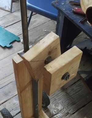 Para montar el carrete en el marco de la en pocas palabras un par de arandelas de goma tenía en la mano sobre el eje, resbaló el carrete en y poner dos arandelas de goma más. Del agujero a través del extremo de las bodegas de eje un clavo que sirve como un alfiler. También perforar un agujero en la parte inferior del codo de la pipa e inserta un alfiler para que no se balancean hacia adelante y hacia atrás.