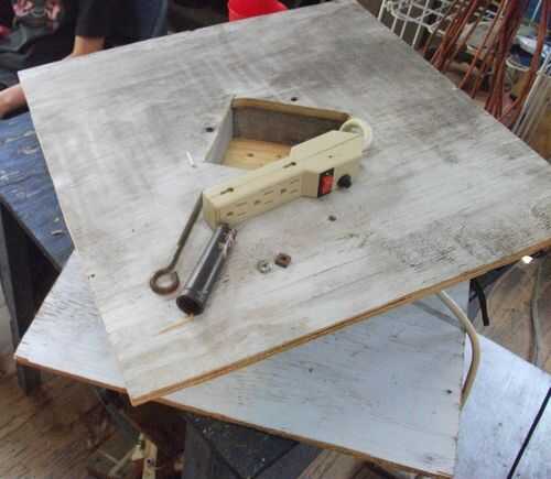 En lugar de ir a la molestia de los cables en un enchufe he decidido a instalar una regleta. He perforado un agujero en el centro de la clavija y había montado la tira en el lado de la bobina. Hice un giro mango de un rodillo de pintura antigua, un perno de ojo y un par de tuercas. Lo último que hice fue atornillado un gancho en la base al acorde de la ruta al carrete.