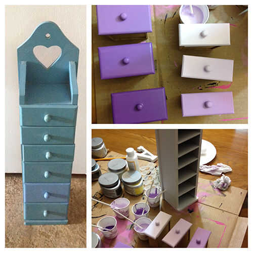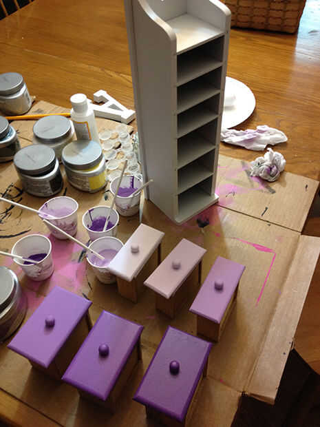 Escoger el color que desea utilizar y luego algunas tazas. Llene la primera (tanto como necesita) con ese color en su estado normal. A continuación rellenamos sin embargo muchas tazas más necesitan con menos y menos el color y agregar blanco a cada uno hasta tener la cantidad necesaria de tonos de su color. Para el mio tengo seis cajones, así que hice seis tonos de púrpura, con el tono final casi un color blanco.