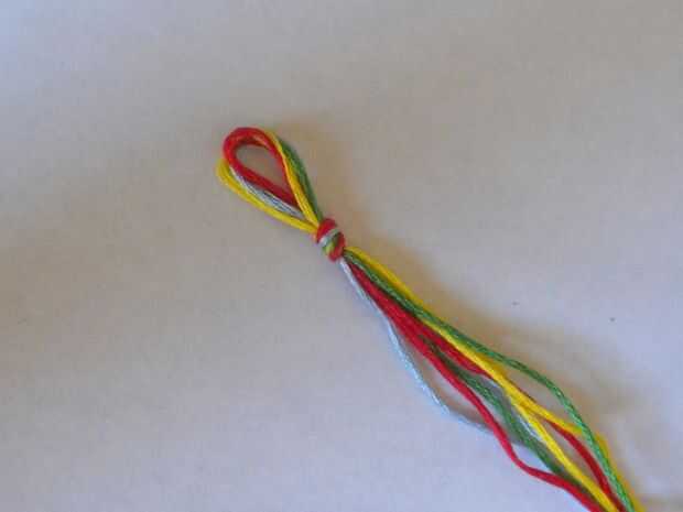Medir y cortar 4 colores de 60" seda del bordado. Doblar las cuatro cuerdas por la mitad y un nudo en la parte superior, formando un pequeño lazo.