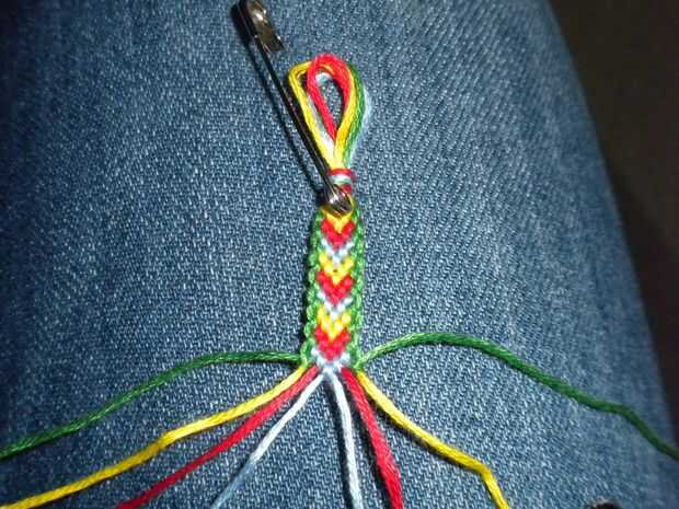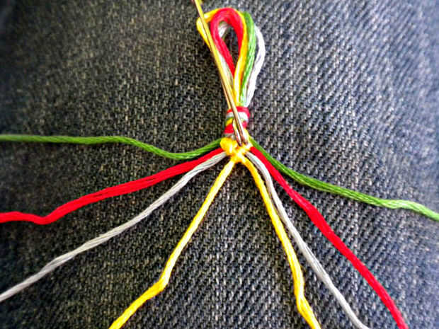 Comenzar a anudar tomando las dos cuerdas (que deben ser del mismo color) al lado de la salida lateral de cuerdas (que se utilizará más adelante para la frontera) y les nudo abajo en un chevron, dejando los dos fuera de cadenas. Luego tome una de las cadenas externas (derecha o izquierda, no importa) y hacer un interior nudo y nudo exterior sobre sting junto a él. Ello en tanto fuera de cadenas. Eventualmente, esto formará la frontera.