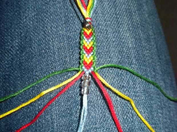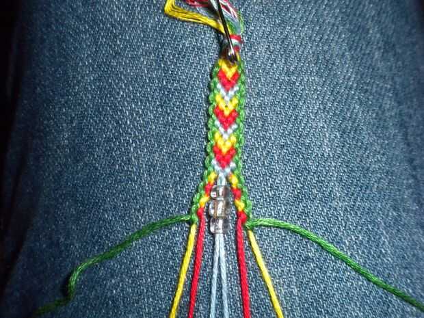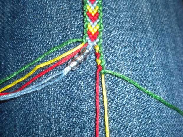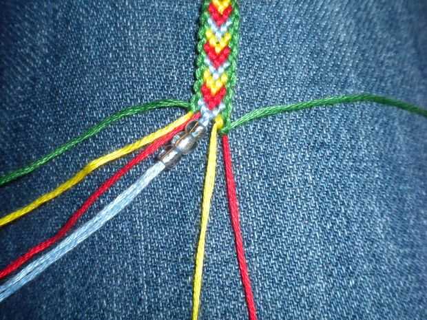 Seguir haciendo cuarto paso hasta tener 8-9 galones. Luego, enhebrar tres bolas en las dos secuencias medias (puede utilizar una aguja si es necesario). Dejando de lado las cuerdas fuera otra vez y utilizando las dos cuerdas entre las cadenas exteriores y los granos, hacen un interior nudo con una de las cadenas, entonces dentro de nudo con la otra. Hacerlo en ambos lados varias veces hasta que los nudos son de la misma longitud que los granos.