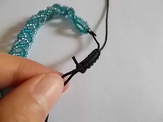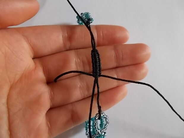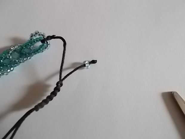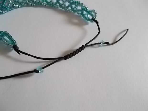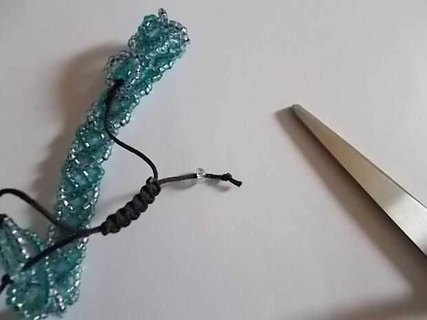 Corte y chamuscar (o lenguado con pegamento) la cadena extra en el macrame nudos. Colocarse la pulsera en su muñeca y estimar cuánto tiempo deben ser las dos cadenas en los extremos de los filamentos con cuentas (mina son aproximadamente de 2".). Poner una tira de la cadena (opcional) y haga un nudo para que no salga de los Plaza de macrame nudos de antes. Luego corte y chamuscar (o use pegamento en) los nudos al final otra vez.